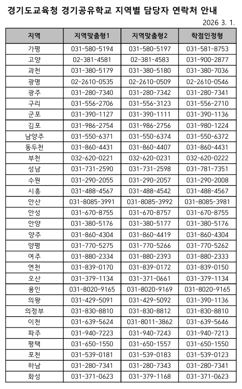지역별 경기공유학교 담당자 연락처 입니다. (2026. 3. 1.기준)