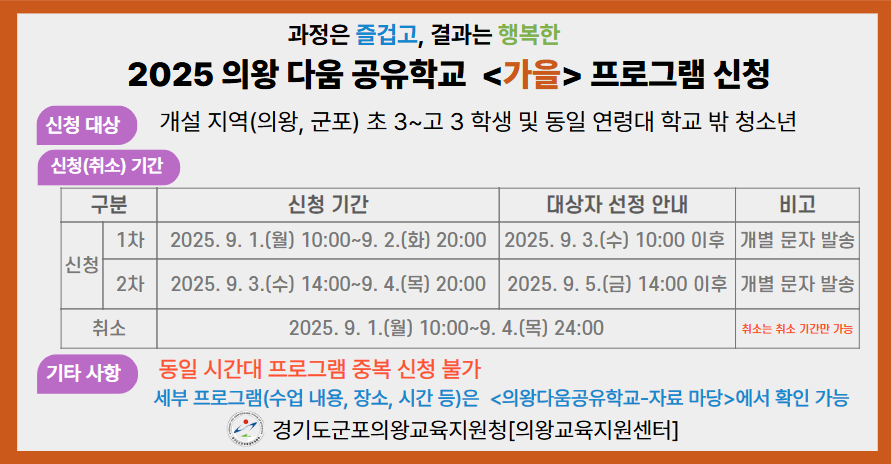 2025 의왕 다움 공유학교 <가을> 프로그램 수강 신청을 다음과 같이 안내하오니, 참고하시기 바랍니다.